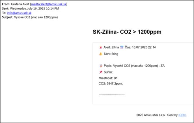 Pri odchýlkach alebo poruchách systém generuje automatické notifikácie (napr. e‑mail). Dokáže vyhodnotiť rôzne stavy popísané vyššie . Notifikácie sú plne konfigurovateľné podľa závažnosti, tak, aby neboli príliš časté.