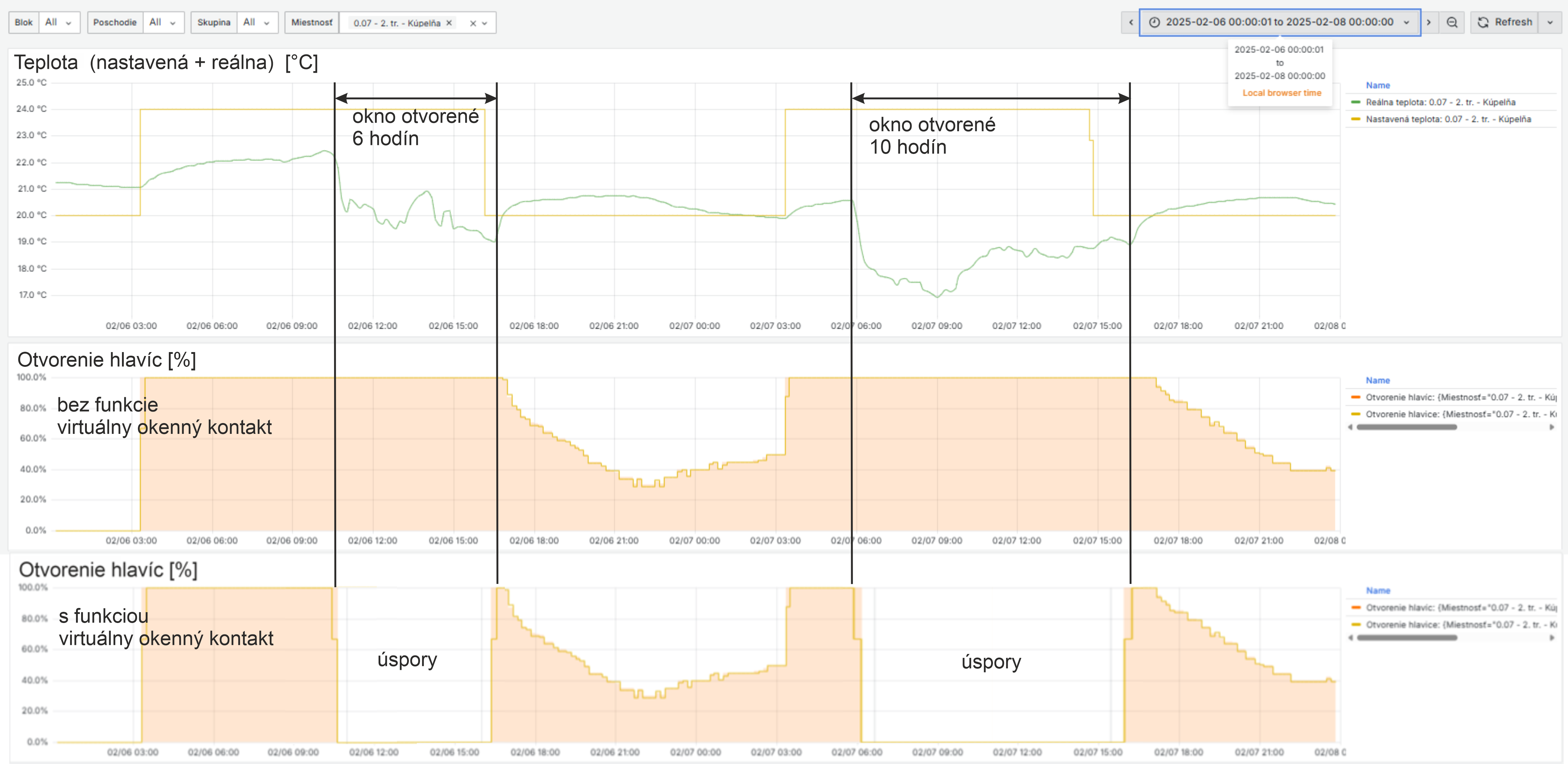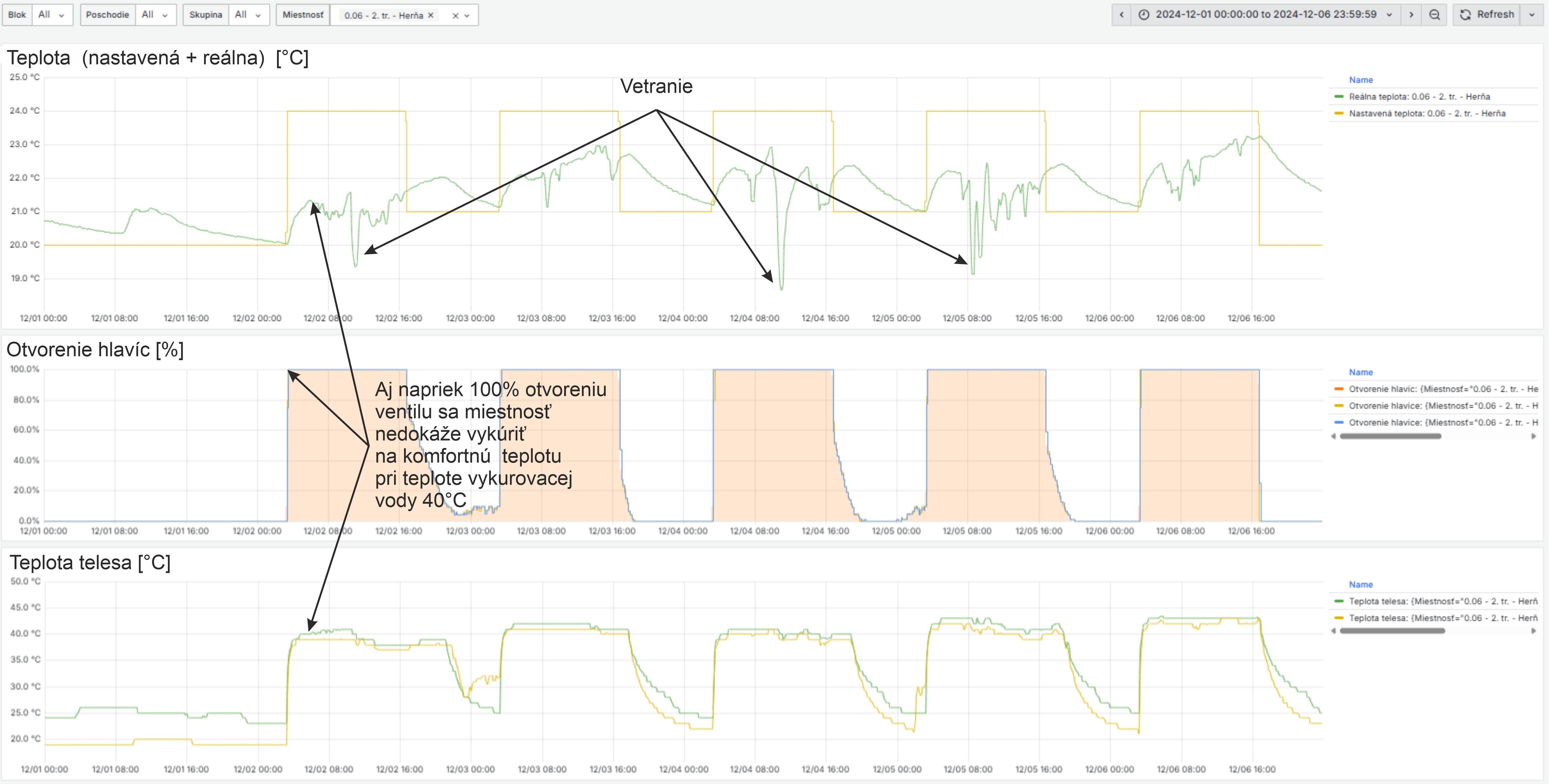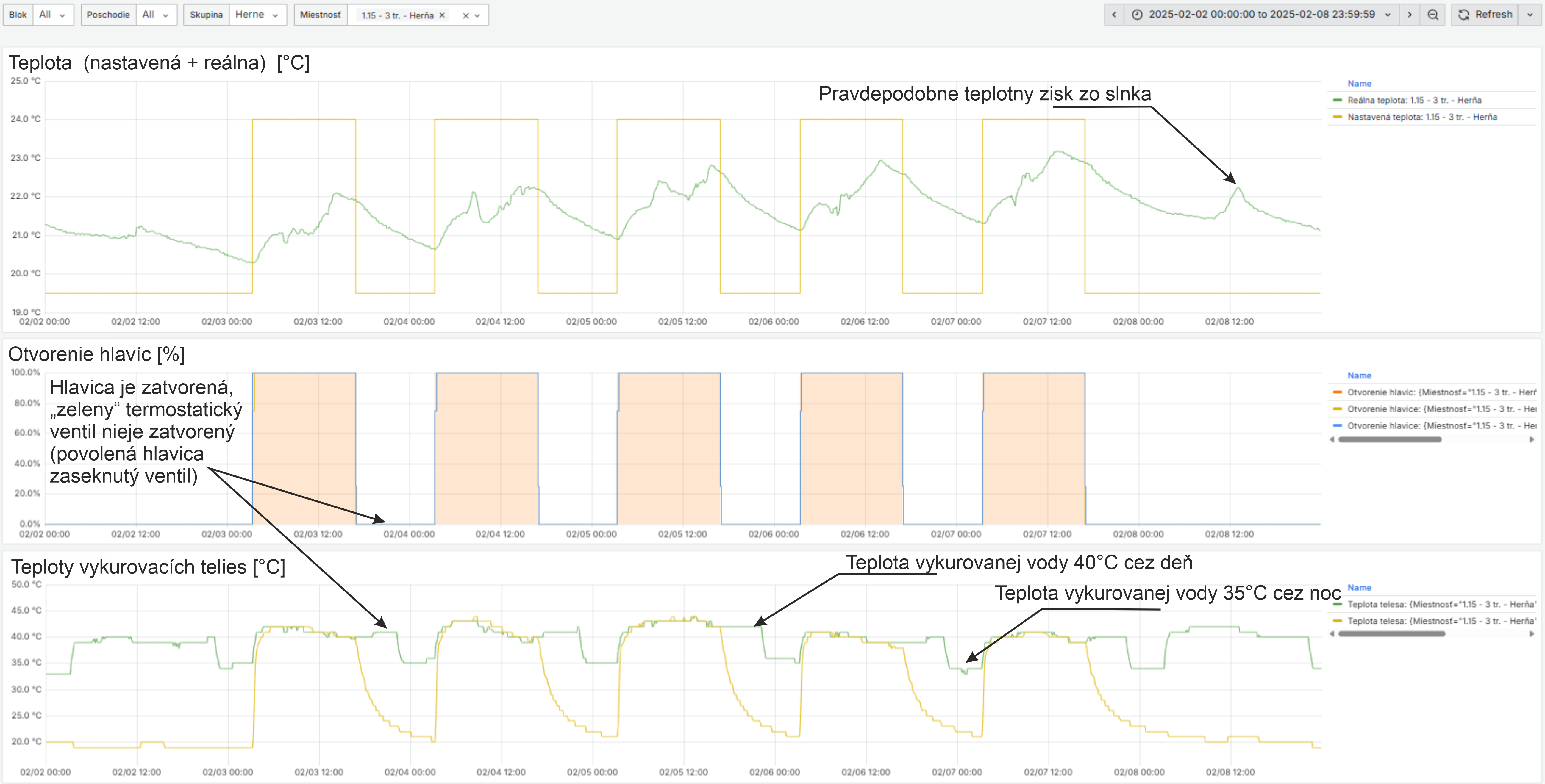 Koreláciou percenta otvorenia hlavice a teploty vykurovacieho telesa vie systém, prípadne používateľ, vyhodnotiť povolenú alebo odmontovanú hlavicu, zlý termostatický ventil či zavzdušnený radiátor. Porovnaním s aktuálnou teplotou dokáže systém rozpoznať nedokúrené miestnosti a príčinu nedokúrenia (nízka teplota vykurovacej vody, poddimenzované vykurovacie telesá, neefektívne vetranie). Na grafe 2 je vidieť, že teplota na jednom z radiátorov je aj napriek zatvorenej hlavici nemenná. To môže znamenať, že hlavica je na ventile povolená alebo je ventil poškodený a treba ho vymeniť. Na grafe 3 je príklad miestnosti, ktorú nie je možné vykúriť na komfortnú teplotu. Dôvodom môže byť nízka teplota vykurovacej vody alebo nesprávne navrhnuté výkony vykurovacích telies.
