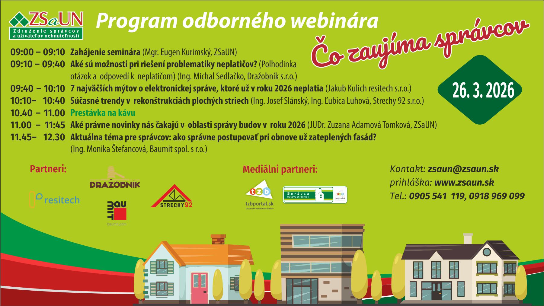 Published On: 7. apríla 2026Kategórie: Správa budov, Kurzy, školeniaWebinár „Čo zaujíma správcov“ sa stal za posledných 5 rokov obľúbeným u správcov z celého Slovenska. Prvý tohoročný webinár sa uskutočnil 26.3.2026 a musíme skonštatovať, že bol nadmieru úspešný.